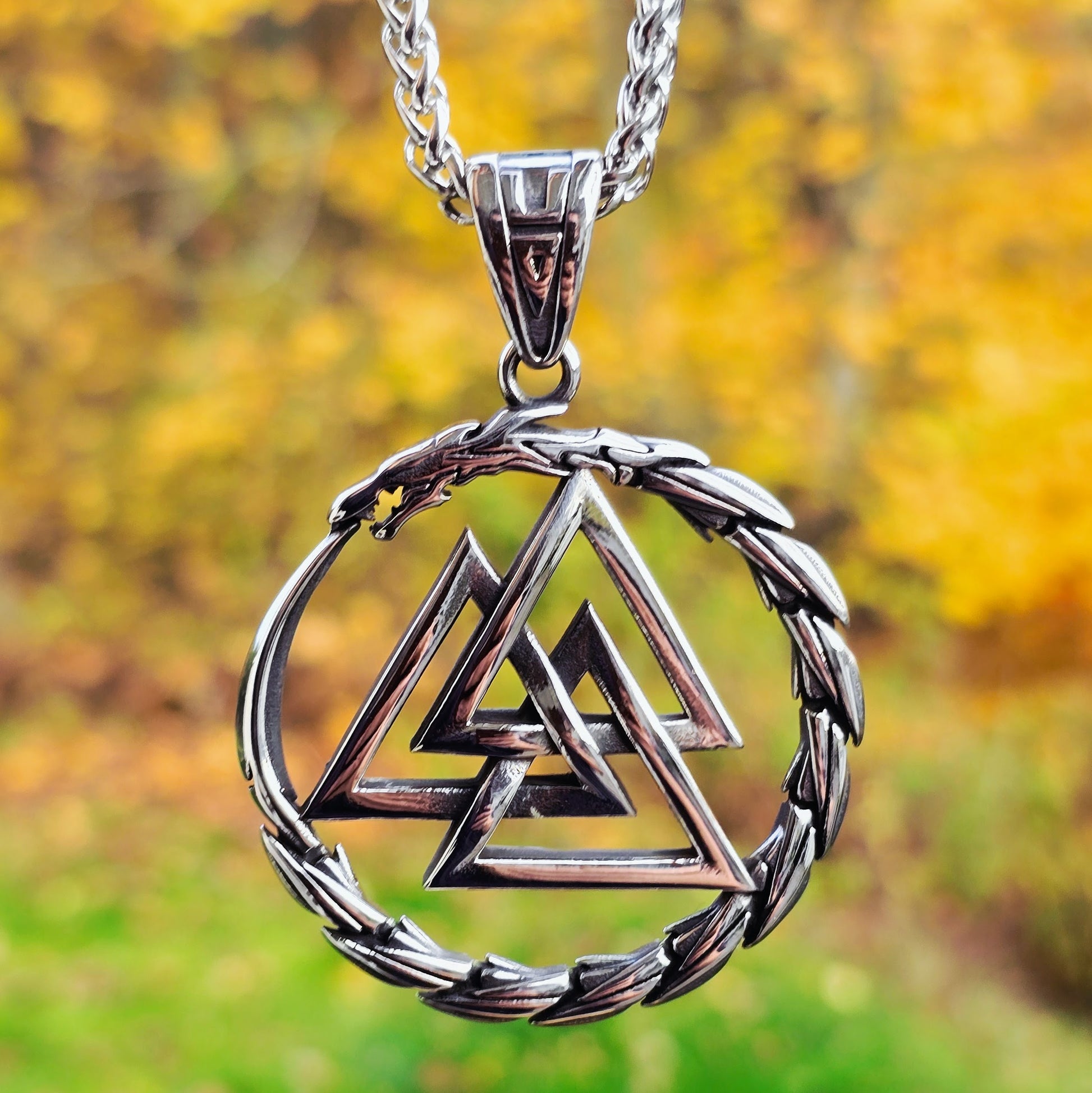 Die kraftvolle Halskette „Valknut Nidhöggr“ vereint zwei kraftvolle Symbole aus der nordischen Mythologie: Valknut, das für Odin, Schutz und die Macht über Leben und Tod steht, und den Weltendrachen Nidhöggr, der in seiner Ringform die ewige Erneuerung und den endlosen Kreislauf des Lebens symbolisiert. Das detailreiche Drachenmotiv umrahmt die ineinander verschlungenen Dreiecke und verleiht dem Anhänger eine beeindruckende Tiefe.