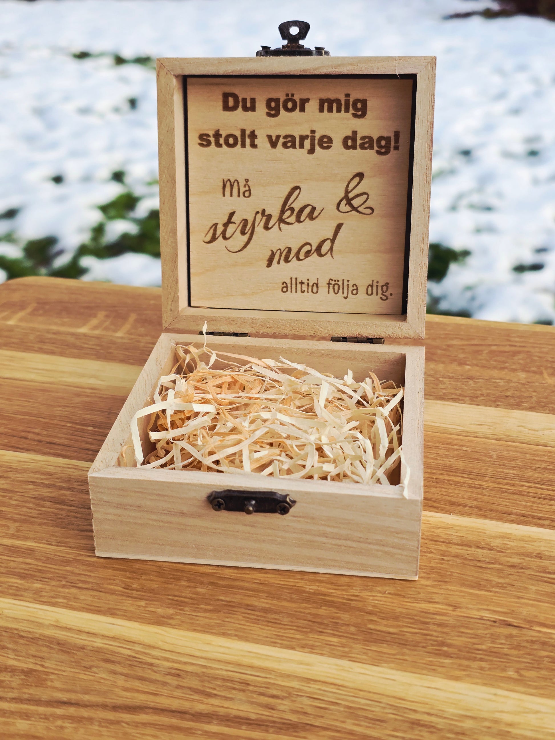 Det unika med denna ask är det personliga inlägget som kan graveras med egna texter, namn, datum eller korta budskap. Detta gör varje smyckeskrin till ett betydelsefullt minne och en uppskattad gåva vid tillfällen som födelsedagar, bröllop, dop, årsdagar eller som en romantisk överraskning.