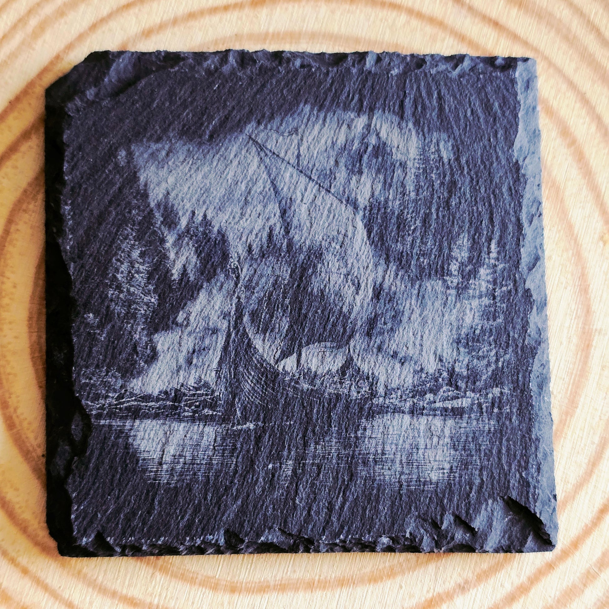 These coasters are made from genuine natural slate and combine a raw, rustic appearance with carefully engraved Viking-inspired motifs. Each piece is laser engraved with a detailed design rooted in Nordic mythology, symbolising strength, courage and history.