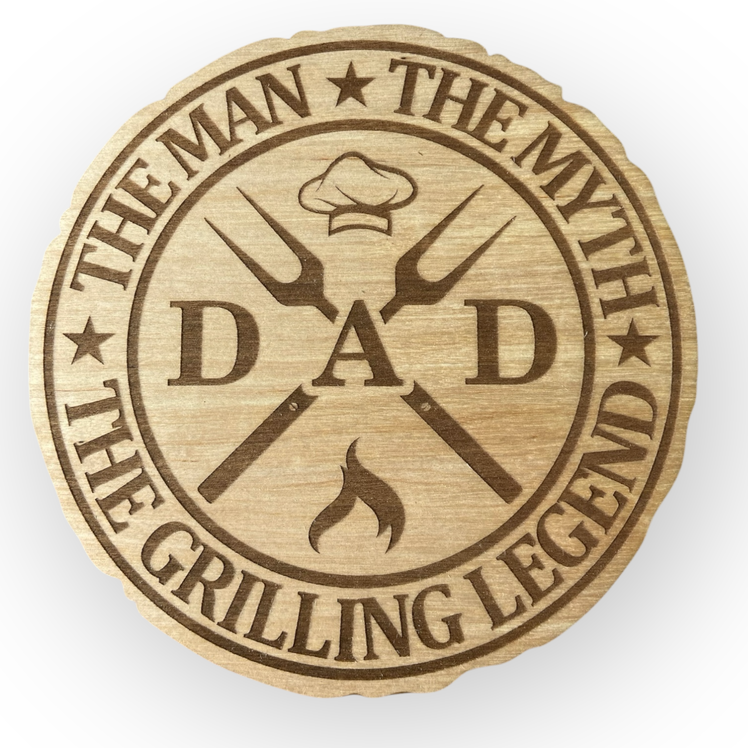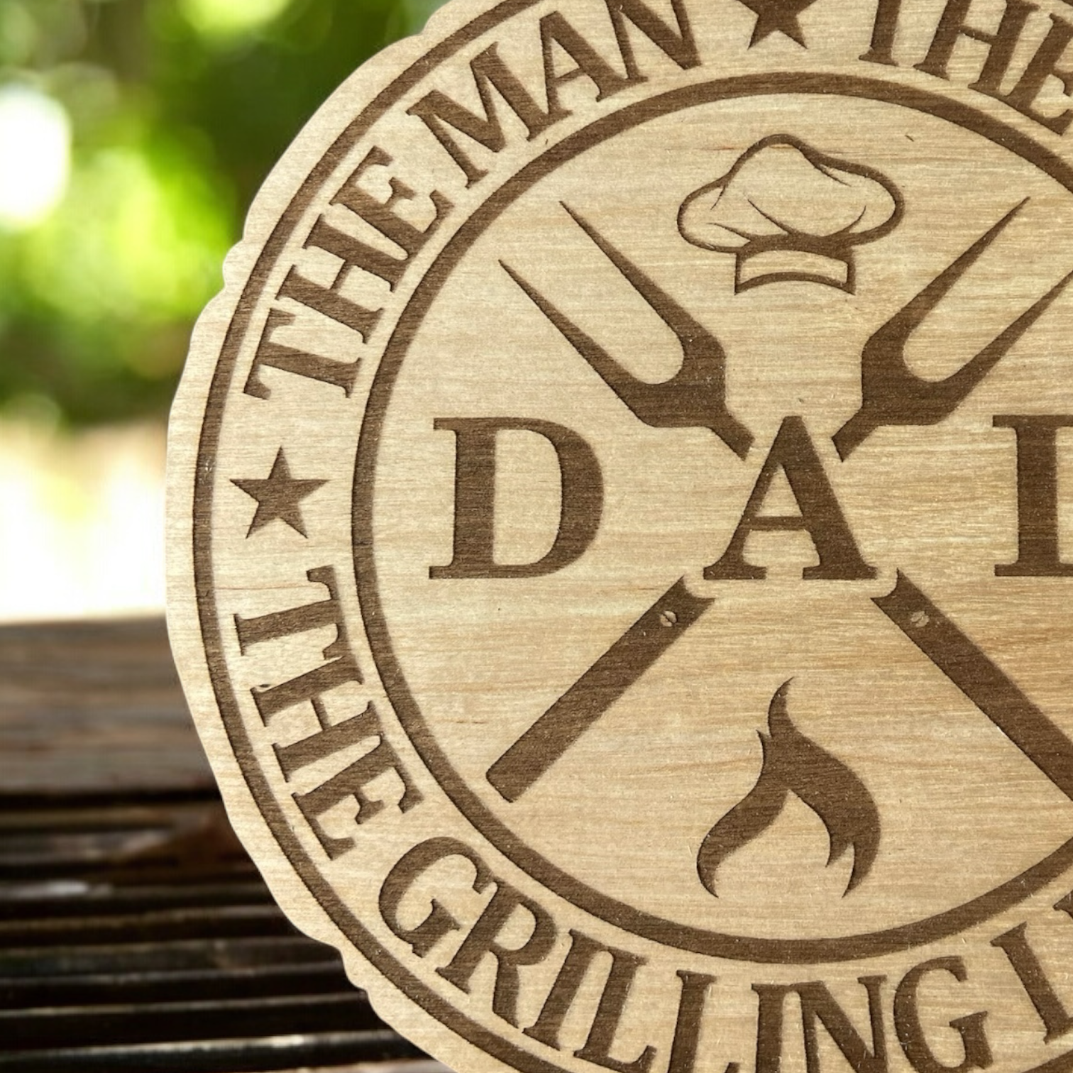 Denna högkvalitativa träskylt är den perfekta presenten för alla grillmästare och stolta pappor. Den detaljerade graveringen bär det humoristiska och samtidigt hedrande budskapet: "Dad - The man, the myth, the grilling legend."Kanten, som är inspirerad av en naturlig trädstam, förstärker den rustika och autentiska känslan och gör varje skylt unik.