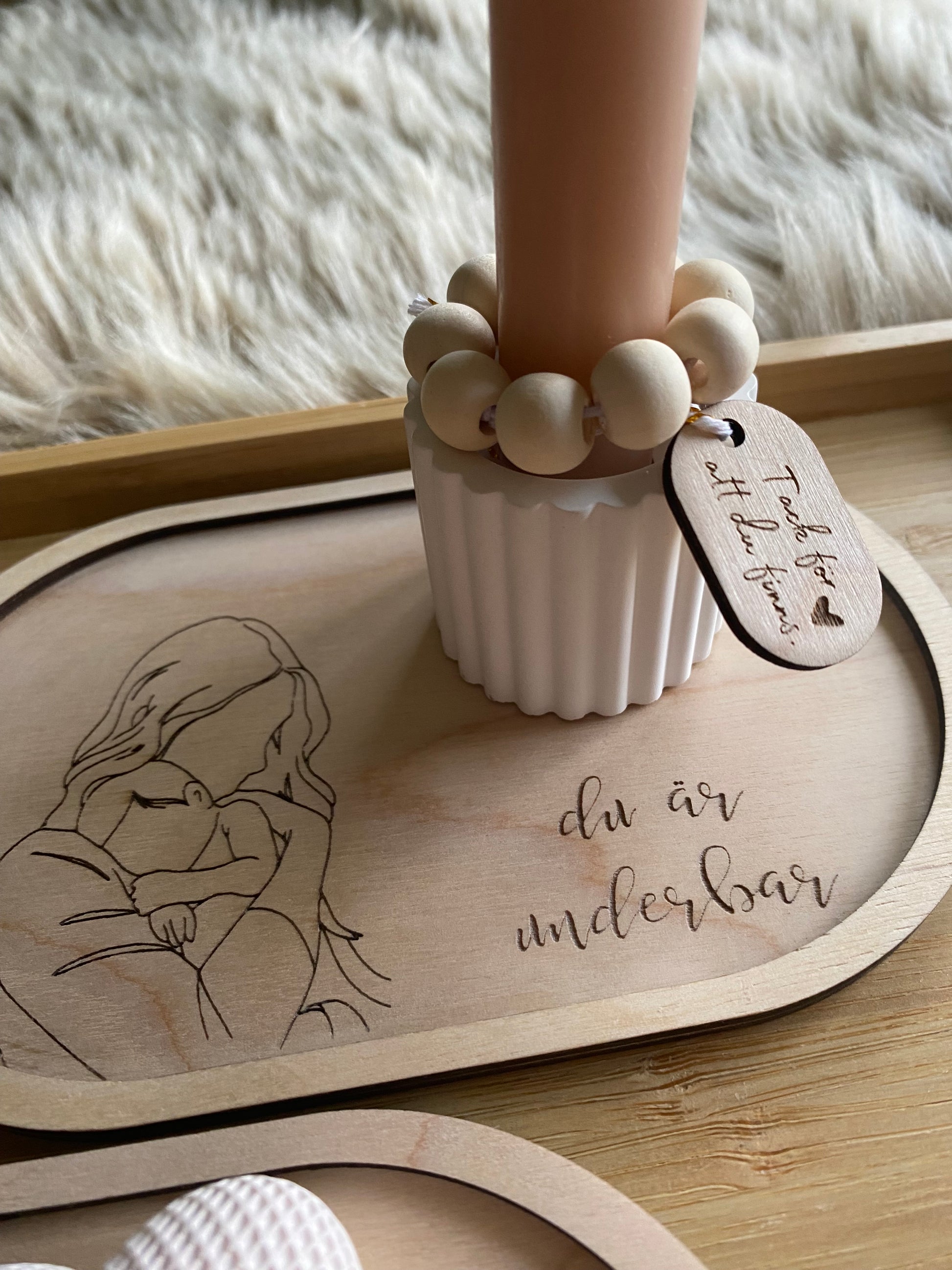 En kärleksfull gåva till någon som alltid finns där. Denna vackert graverade bricka i trä föreställer en mamma som håller sitt barn – en symbol för närhet, trygghet och ovillkorlig kärlek.