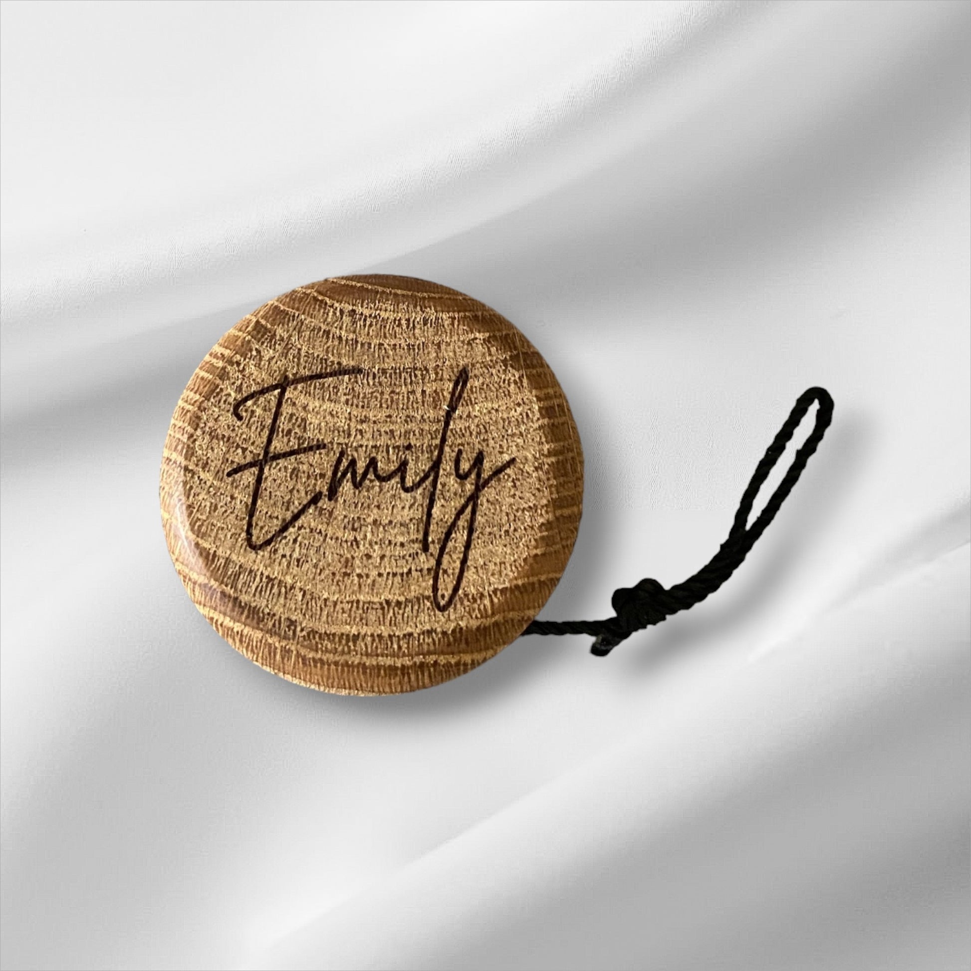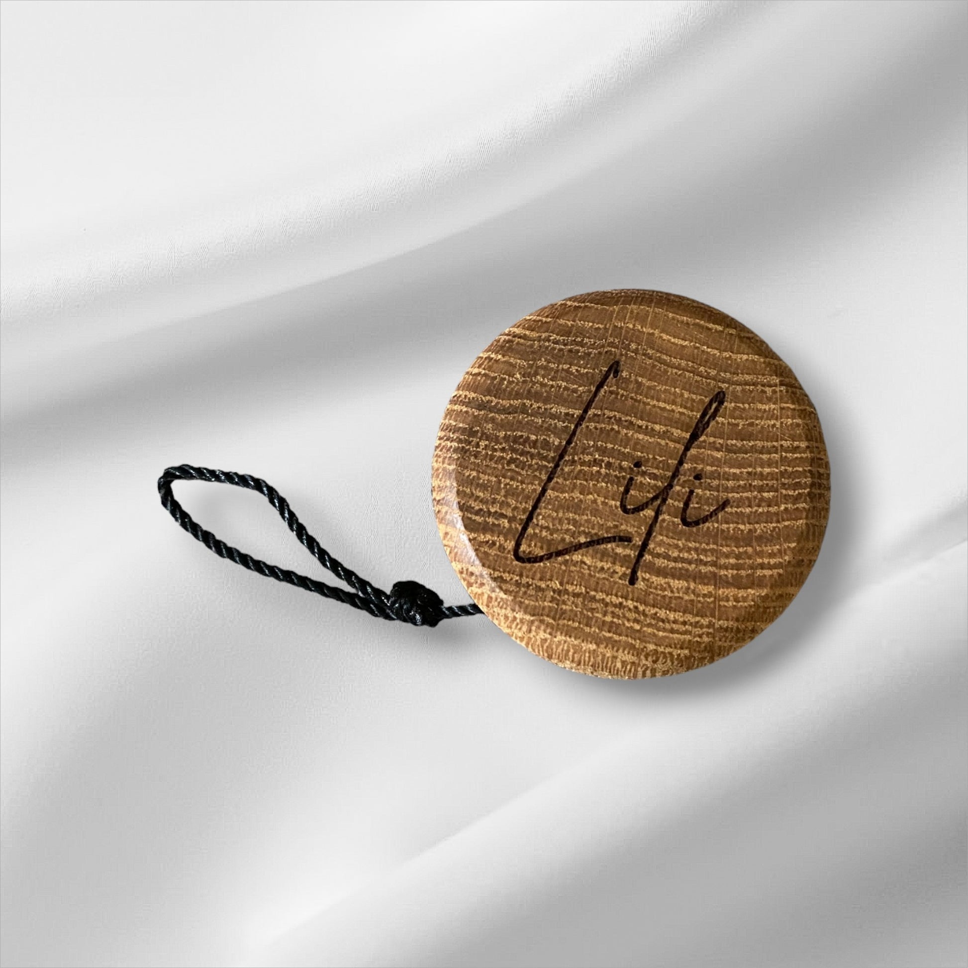 Elegant träjojo av oljad ek och svart snöre med ögla