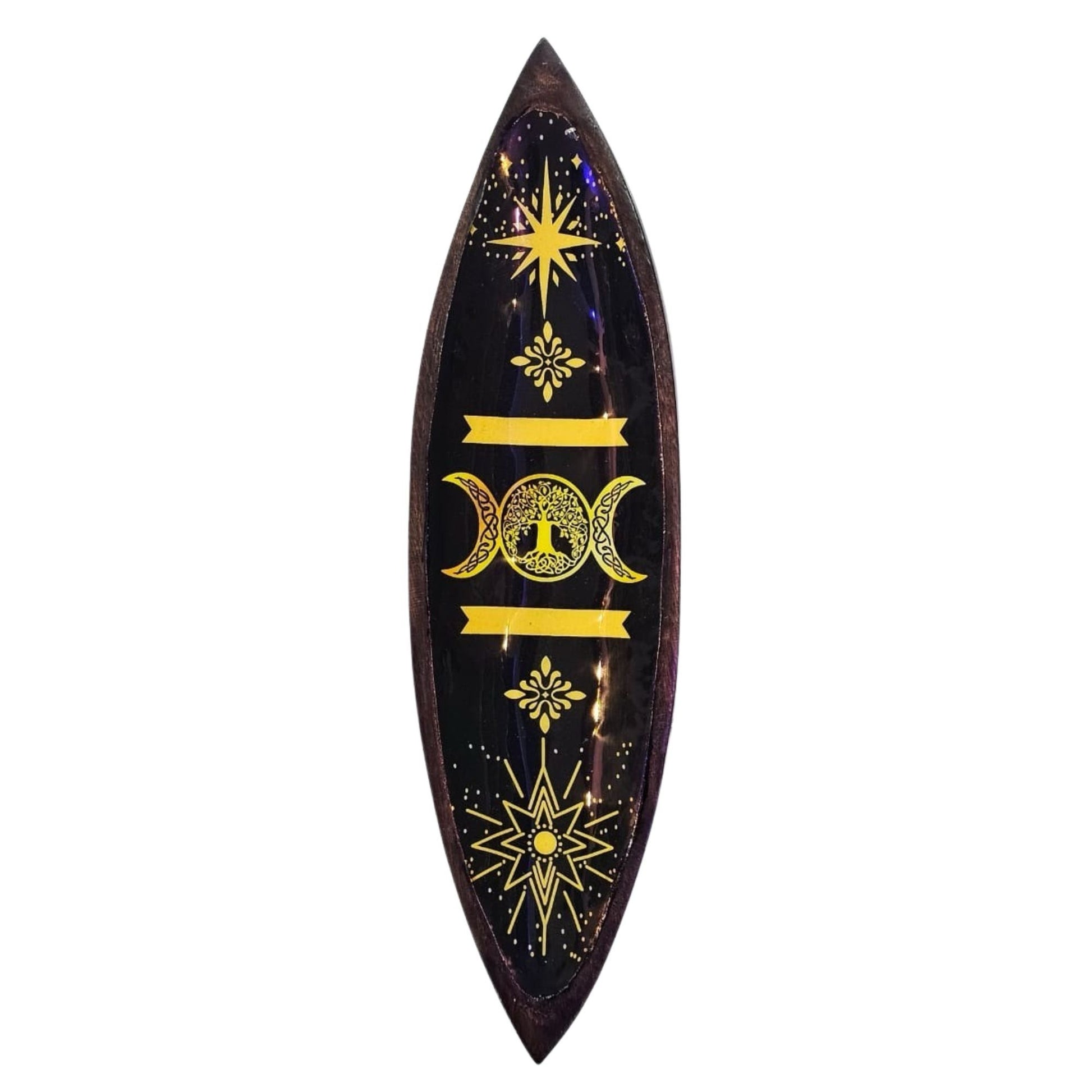 Denna unika rökelseskål är tillverkad i robust mangoträ och har en glänsande, emaljerad yta som pryds av symbolen för Månfaserna (Triple Moon) tillsammans med det tidlösa Livets Träd. Kombinationen står för balans, cykler, tillväxt och andlig visdom – perfekt för alla som vill fördjupa sin spirituella praktik.