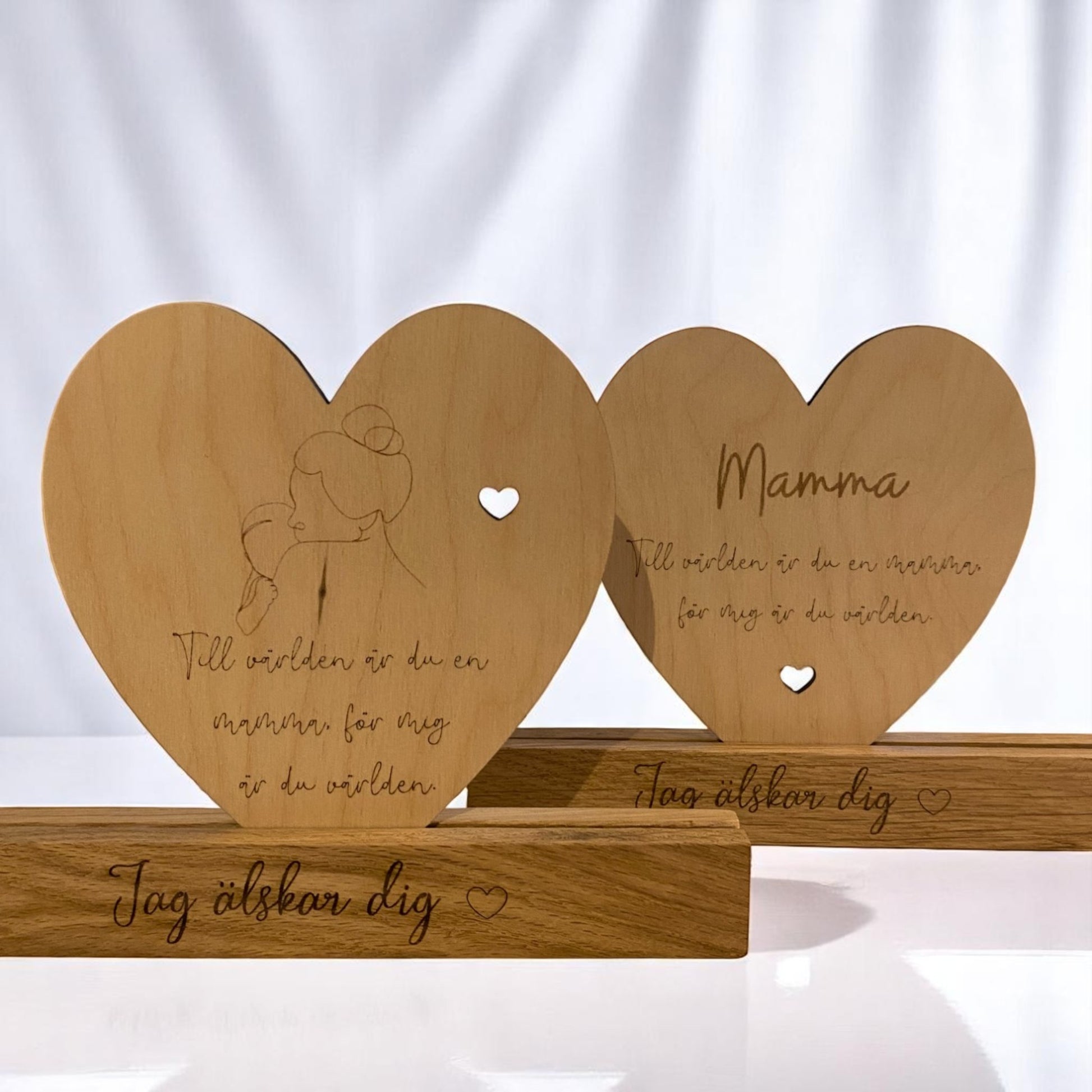 Denna stående dekoration är handgjord i ljust trä, med varsamt graverad text och ett stilrent ställ – en tidlös gåva som säger mer än tusen ord.