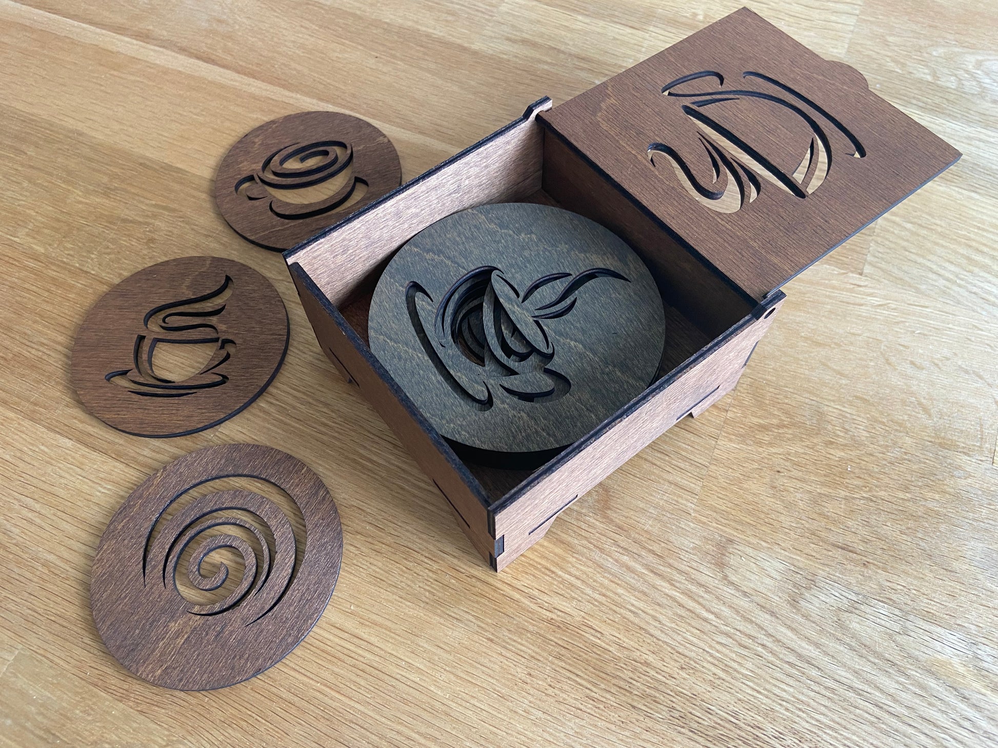 Lådan levereras som standard utan utskärning eller gravyr. Om du beställer glasunderlägg inklusive en låda kommer lådan att tillverkas så att den matchar underläggen.