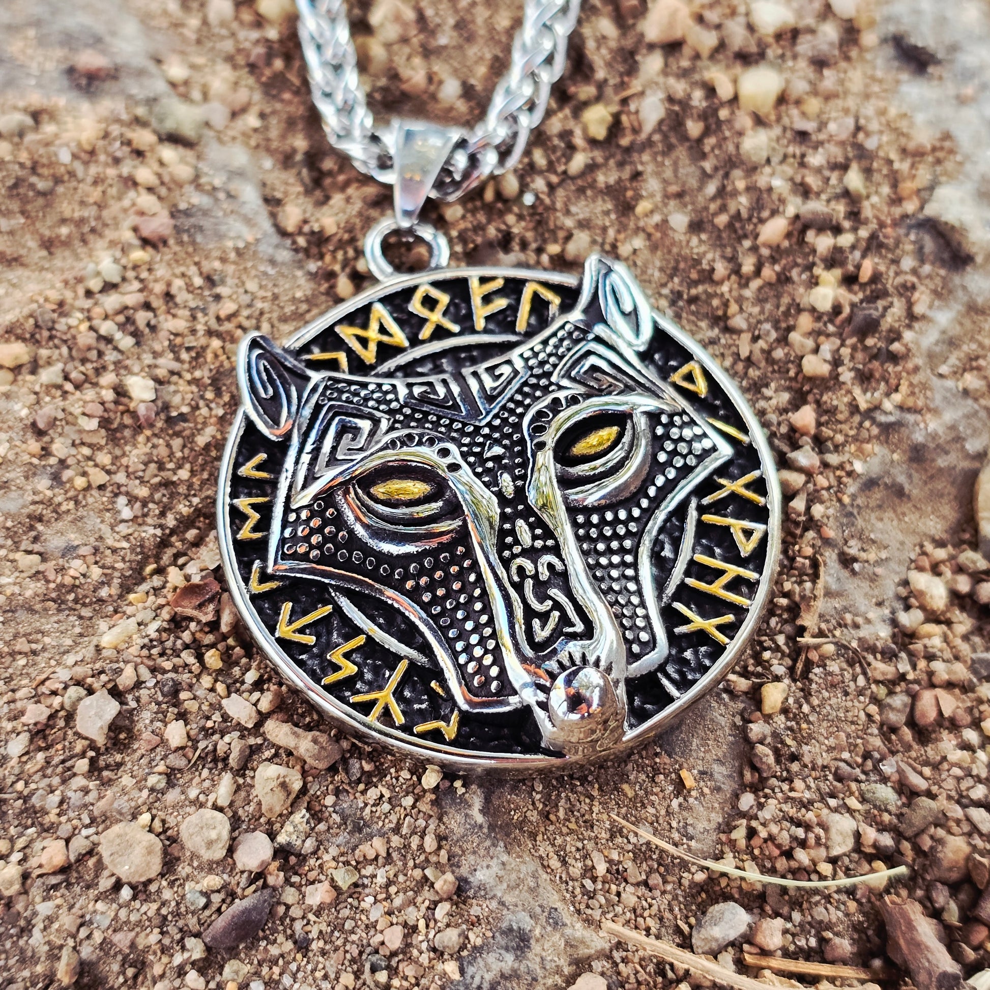 Tillverkat av högkvalitativt 304 rostfritt stål och utrustat med en 60 cm vetekedja (4 mm bred), förenar detta smycke tålighet, kontrast och tidlös nordisk design. - Det noggrant utformade hänget visar Fenrir, den legendariska vargen från fornnordisk mytologi, omgiven av kraftfulla runor – en stark symbol för frihet, styrka och kampen mot ödet.