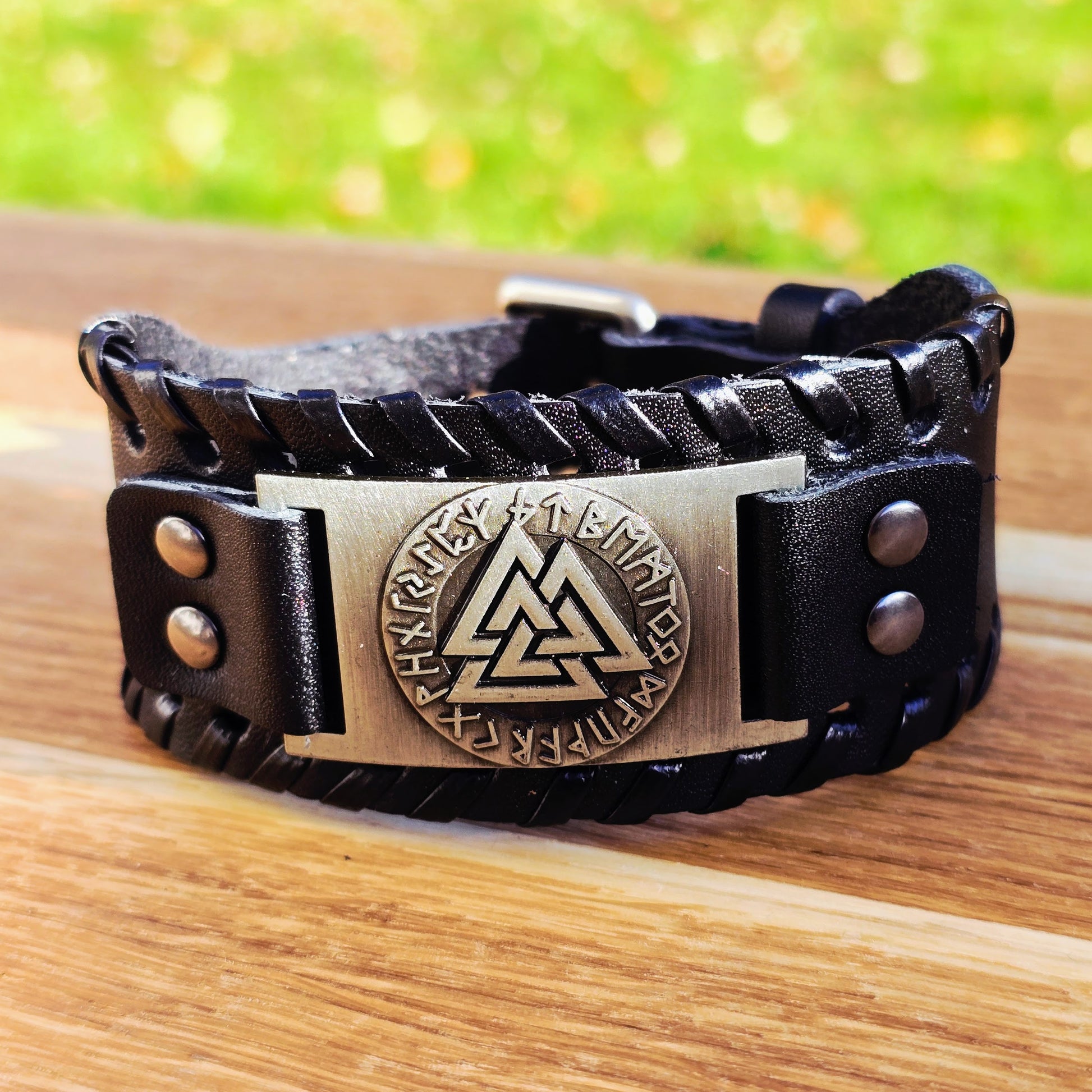 Armband „Valknut“ – Premium-Leder (Schwarz), verstellbar von 19 bis 24 cm