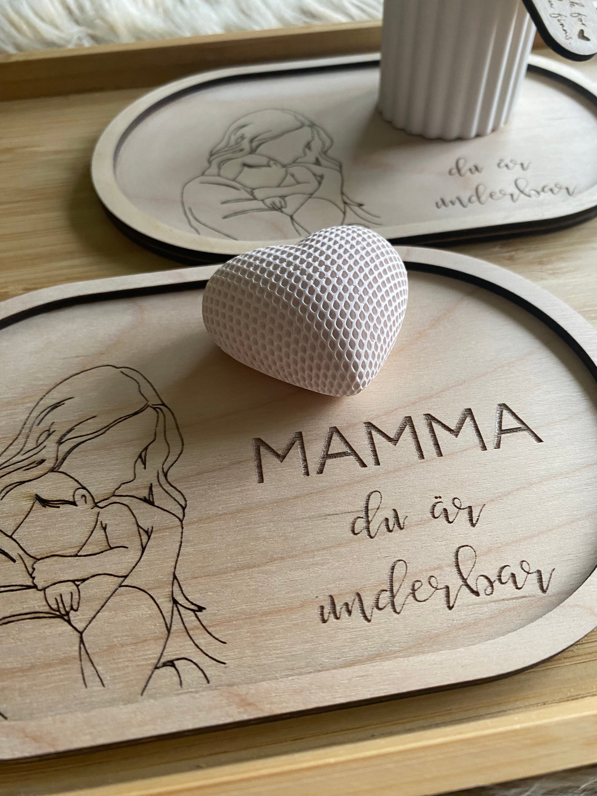 En kärleksfull gåva till någon som alltid finns där. Denna vackert graverade bricka i trä föreställer en mamma som håller sitt barn – en symbol för närhet, trygghet och ovillkorlig kärlek.