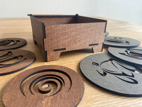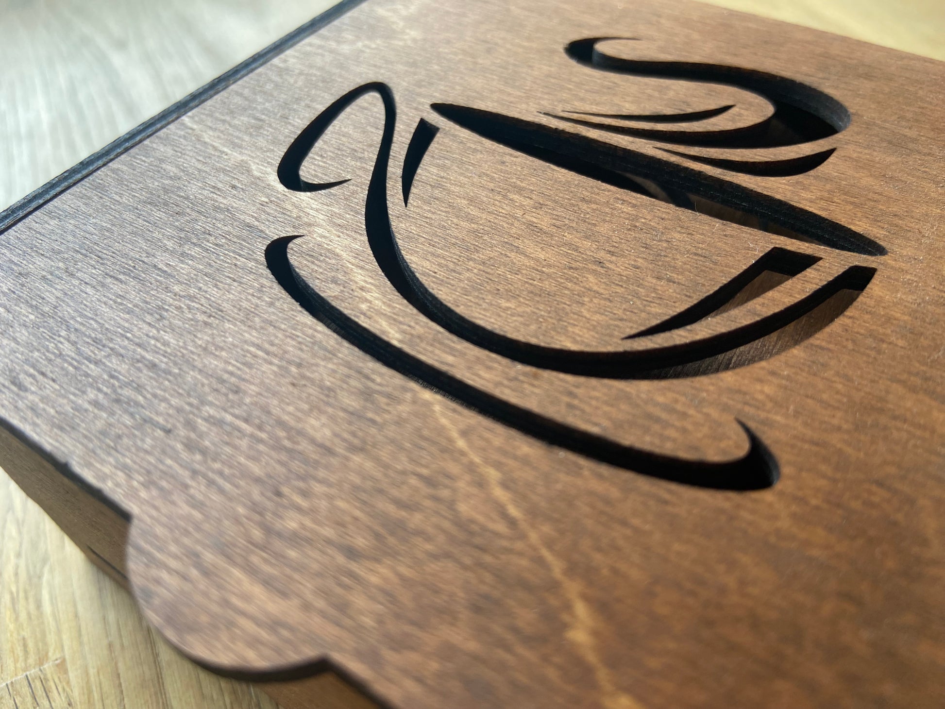 Lådan levereras som standard utan utskärning eller gravyr. Om du beställer glasunderlägg inklusive en låda kommer lådan att tillverkas så att den matchar underläggen.