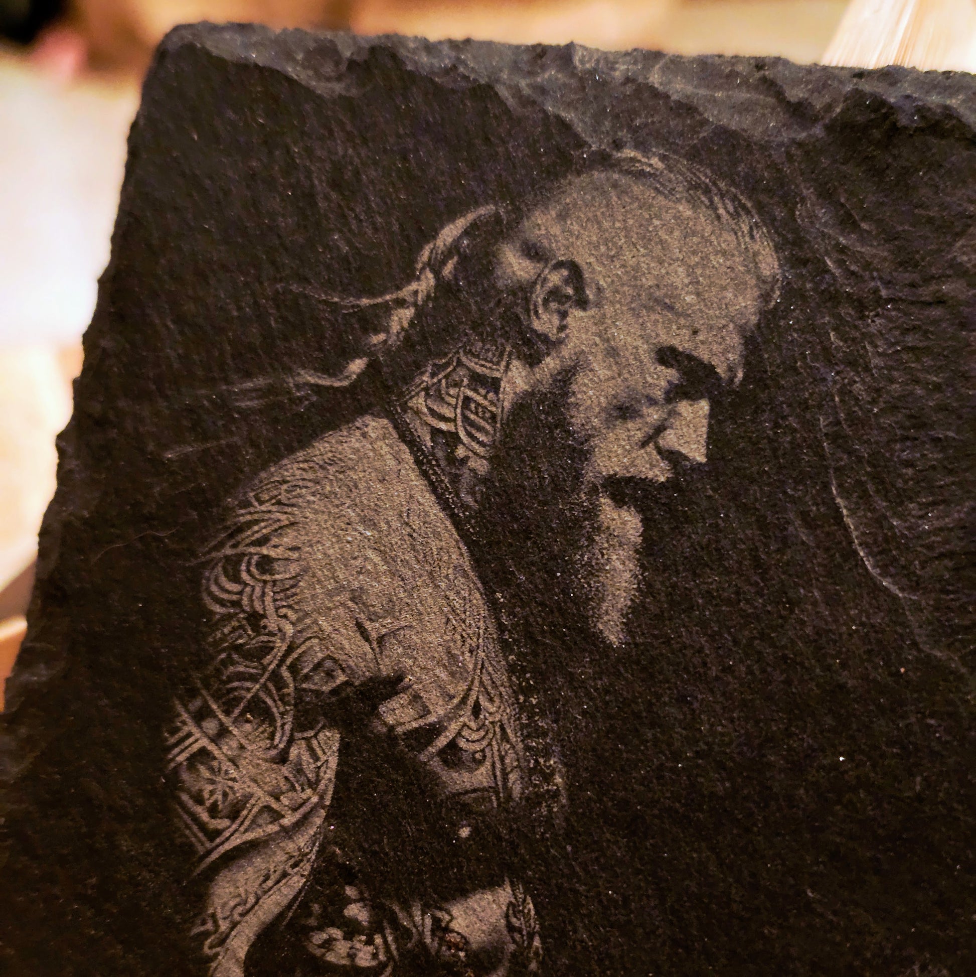 Skydda dina möbler med styrka och stil! Våra glasunderlägg i äkta skiffer förenar naturlig rustik design med nordisk mytologi och vikingainspirerad gravyr.