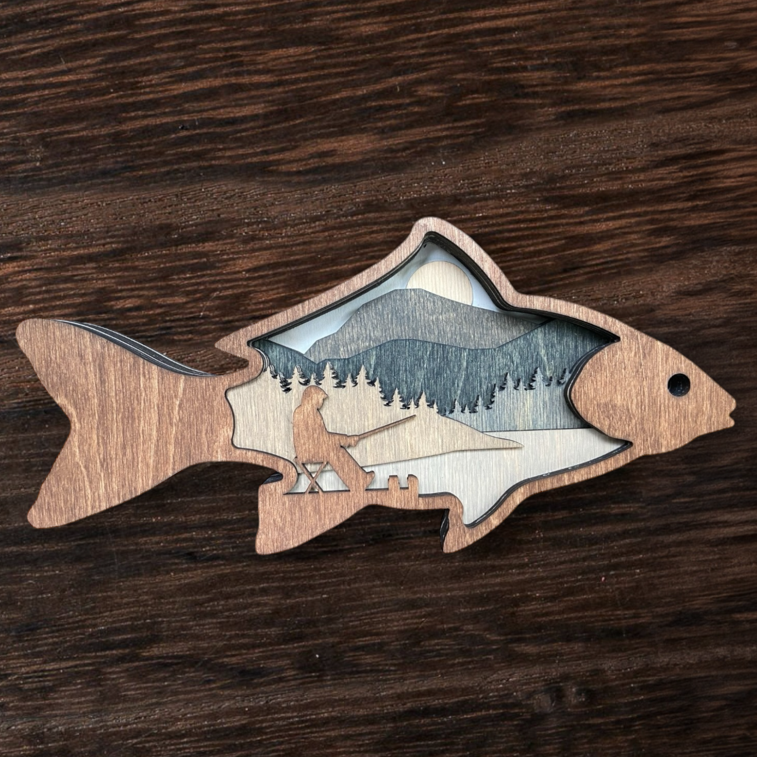 Dyk ner i lugnet av fisket med vår unika väggkonst "Relaxed Fishing". Denna konst består av 9 träskikt, som konstfullt är utformad för att fånga lugnet och harmonin vid fisket. Varje skikt och en annan aspekt av denna populära hobby, från den stilla vattenytan till det mjuka gungandet av fiskespöt.