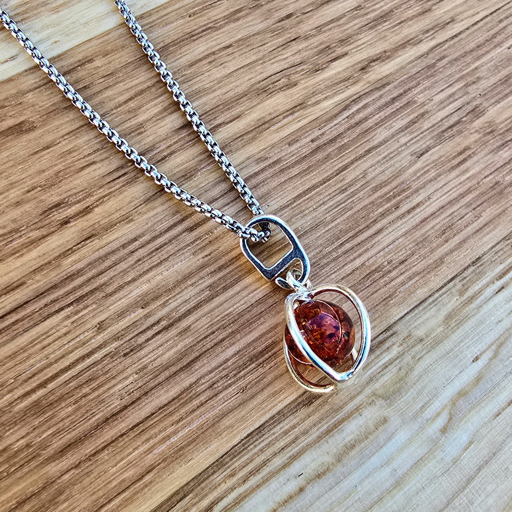 Detta eleganta hÀnge i 925 sterlingsilver pryds av en Àkta bÀrnstenkula pÄ ca 7 mm, skapad ur förstenad trÀharts som format under miljoner Är.