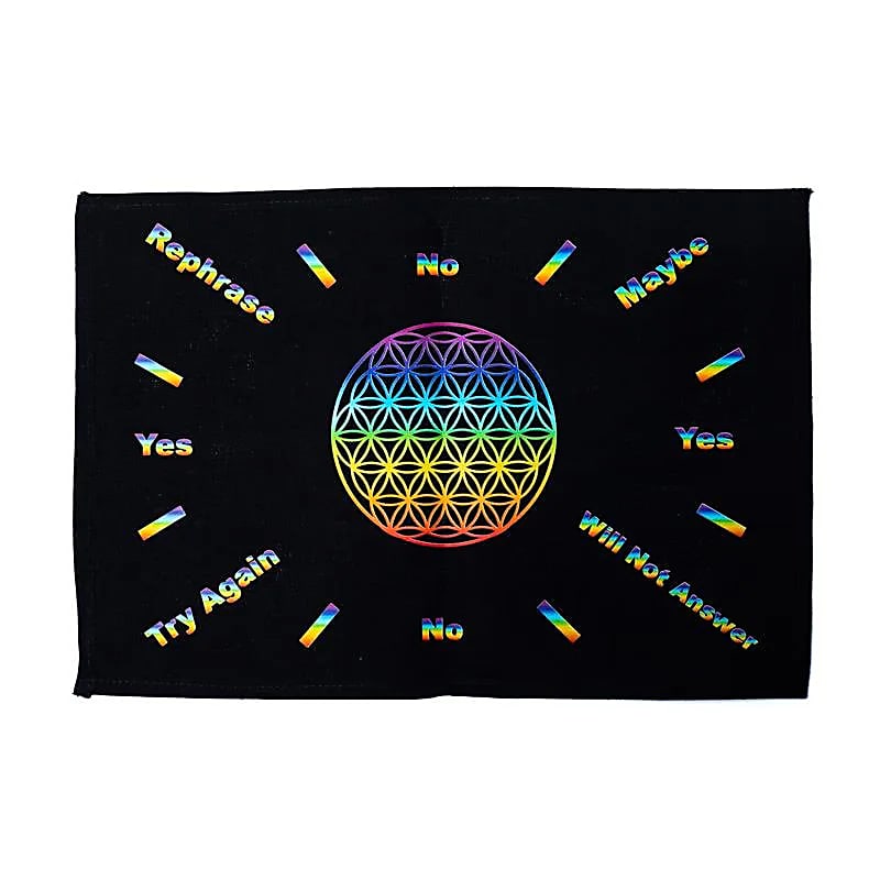 Mattan är prydd med olika svarsalternativ runt Blomman av liv, vilket ger tydlig vägledning under dina pendelläsningar. Blomman av liv symboliserar harmoni, enhet och sammanlänkning av alla levande varelser, vilket gör den till den perfekta bakgrunden för dina andliga utforskningar.