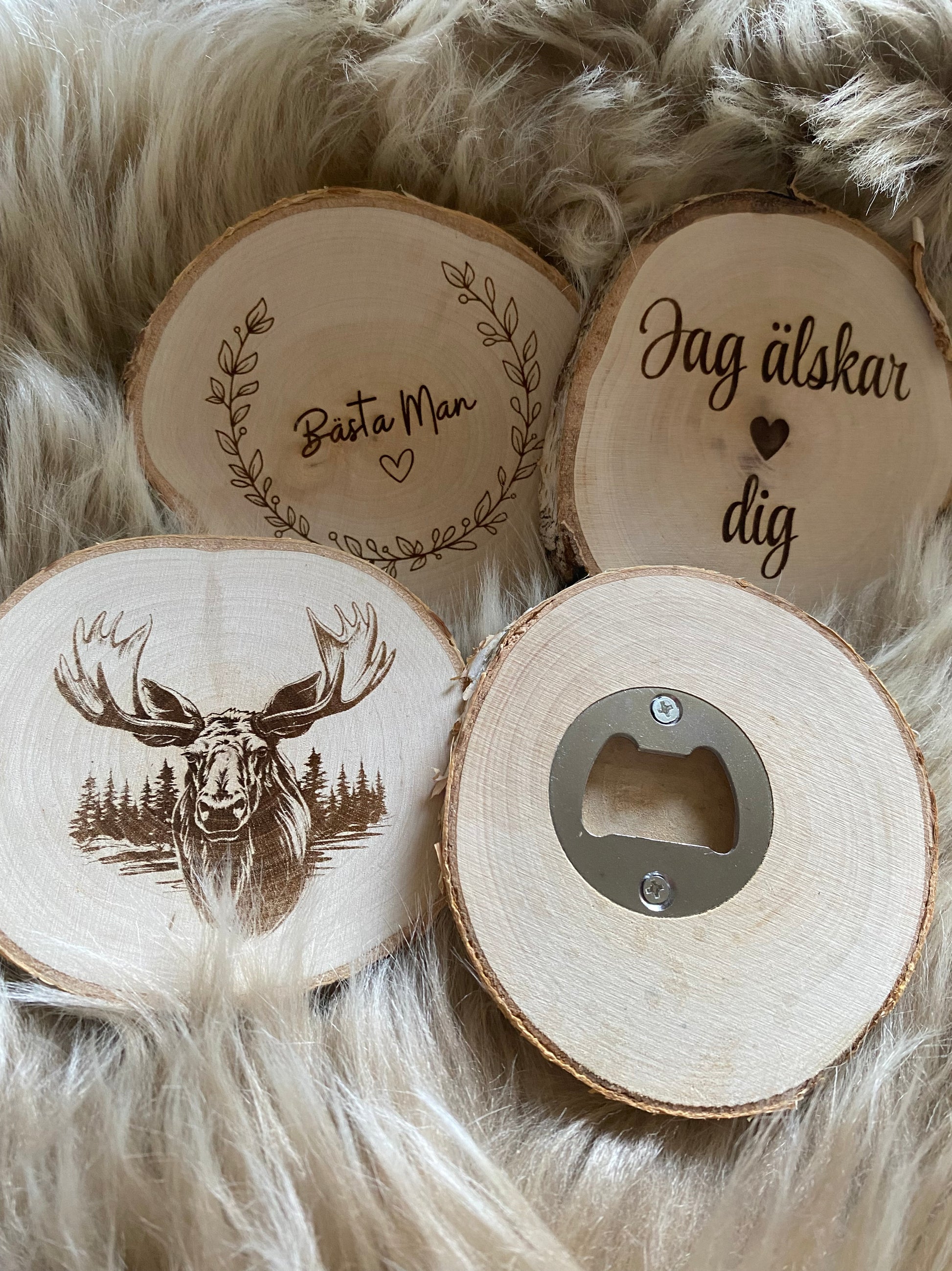 Underlägg i trä med integrerad flasköppnare av björk med bark